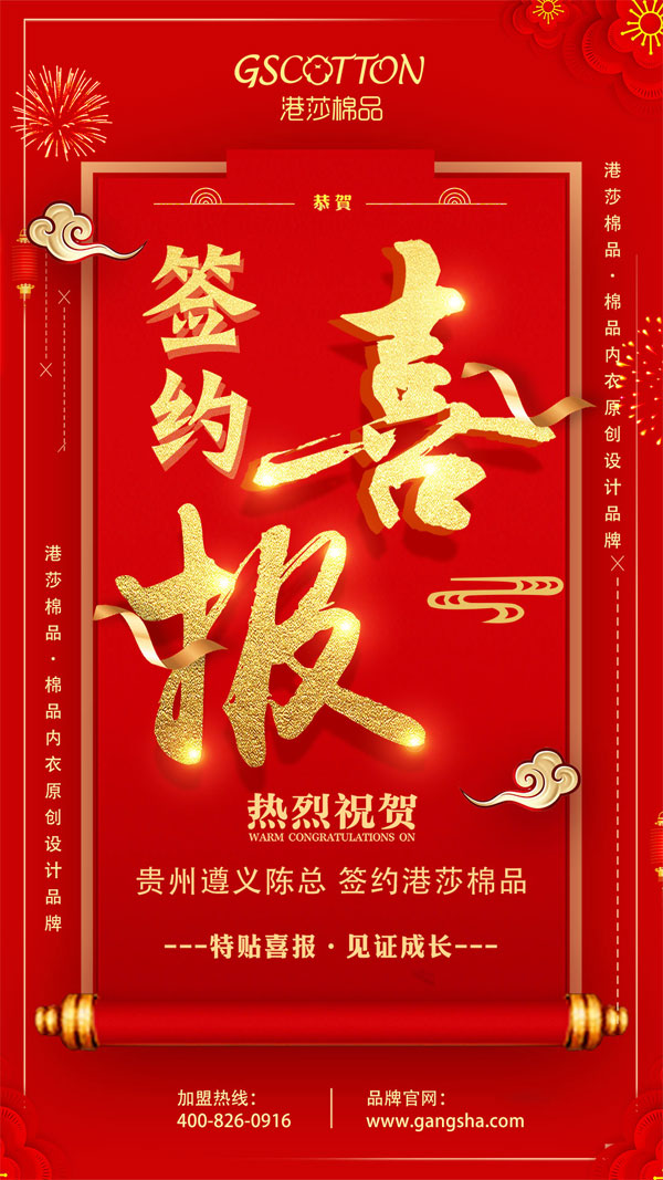 俗話說(shuō)“一年之計(jì)在于春,一日之計(jì)在于晨”,春天到來(lái),萬(wàn)物復(fù)蘇的季節(jié),港莎棉品的簽約勢(shì)頭也像春筍般拔地而起...恭喜我們貴州遵義的陳總,在萬(wàn)千品牌內(nèi)衣中選擇了我們港莎棉品,我們相信,簽約不是終點(diǎn),而是服務(wù)的起點(diǎn),加入港莎棉品是成功的第一步。