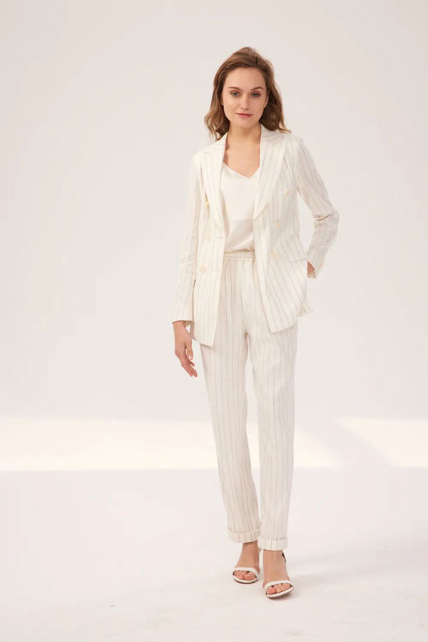 夏季套西就別再選擇深色系啦,紅領女裝定制白色豎條紋西裝很好的平衡了正式與呆板。低飽和度的米白色沉穩內斂,添加咖色條紋和金屬絲交織,具有含蓄的光澤度。緹素進口亞麻混紡面料觸感柔軟,輕薄透氣,整體呈現高級感。