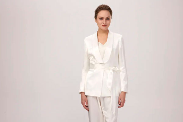 若是出席宴會、典禮等正式場合,醋酸面料的禮服是紅領女裝定制的出色之作。青果領、單排一粒扣設計簡潔大方,白色與醋酸質感的碰撞更透著女性的優雅氣息。