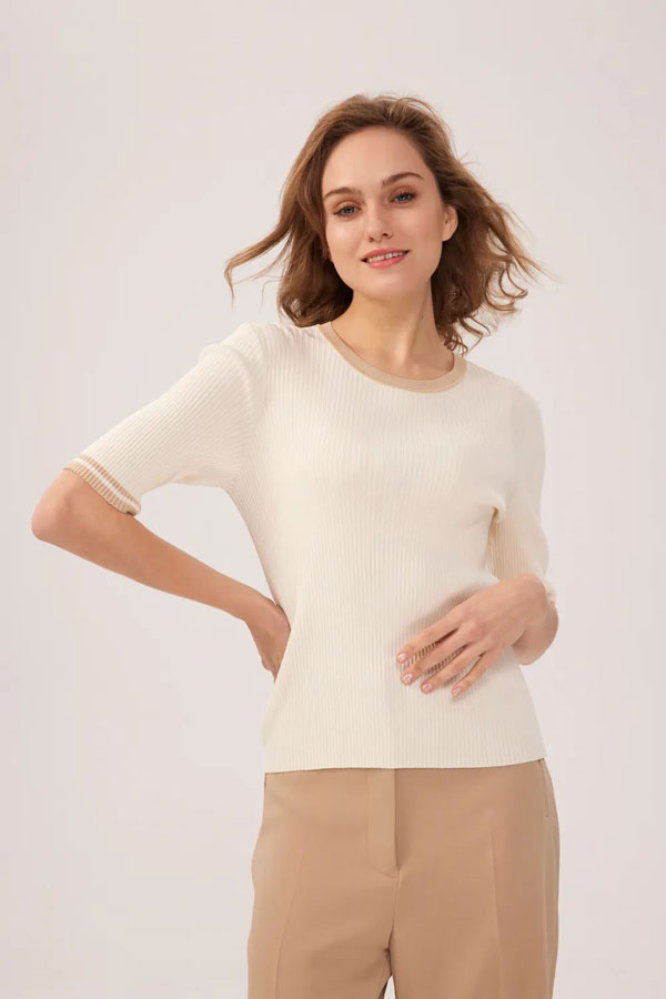 夏季辦公室空調常開,這時可以選擇一件白色針織衫,穿著舒適的同時又能御寒擋風。紅領女裝定制把伊力特抗菌防臭環保面料應用在了這款針織衫上,具有一定防螨止癢、抗紫外線的功能。