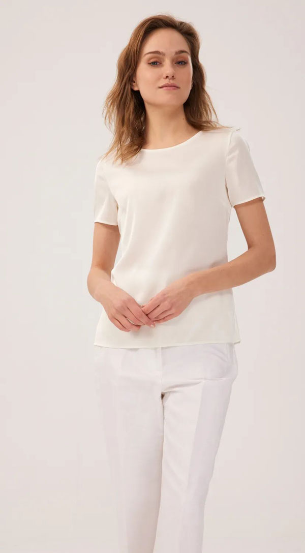 輕薄貼身的衣服往往更考驗設計剪裁,紅領女裝定制挖掘這一需求,將極簡設計融入到了這款白色圓領套頭T恤中。寬松直筒版型穿著無拘束感,單穿或內搭都很不錯。特別的是這件T恤采用了桑蠶絲面料,珍珠般的光澤讓整體簡約而不簡單。