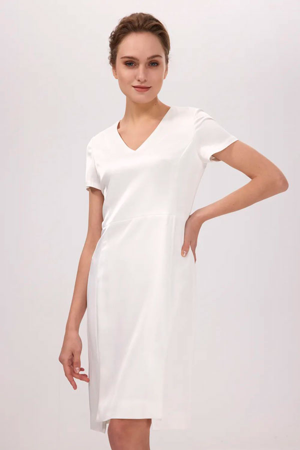 白色連衣裙可以很好的展現女士優雅溫婉的一面,不需要過多的裝飾,不需要繁瑣的款式,簡單的收腰設計就能凸顯出職場女性干練職業的形象。紅領女裝定制這款連衣裙融入巧思,前后下擺開叉看起來更加顯瘦,V領設計拉長脖頸線條,單穿也非常獨特。