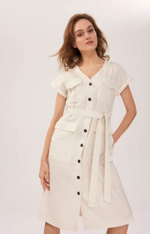 要說夏季透氣吸汗的連衣裙,亞麻面料絕對值得一提。米白色適合大多數亞洲女性膚色,及膝的長度露出纖細的小腿和腳踝,腰帶也為裙子裝飾亮點,通勤聚會實穿性都很強。
