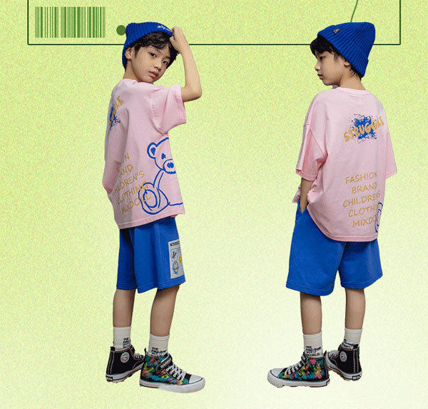 簡潔大方的粉色大T,朝氣陽光感爆棚,撞色明藍色休閑短褲,干凈,隨意,當之無愧為每一個寶馬心中的男孩小粉衣。