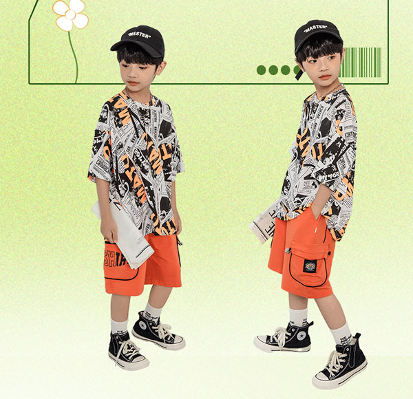 個性報紙圖案滿印,跳色字母印花圓領套頭T,橙色短褲時尚青春活力,穿著要出眾,盡顯韓版INS風!