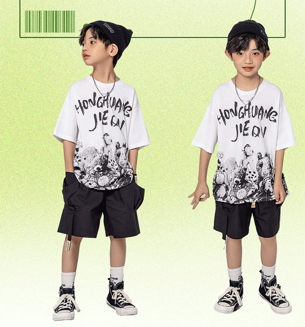黑白經典搭,大T印花黑白渲染,煥發活力。黑色短褲精良剪裁,大兜邊帶設計,又潮又酷,凸顯不俗,品質優良,面料挺括,柔軟親膚!