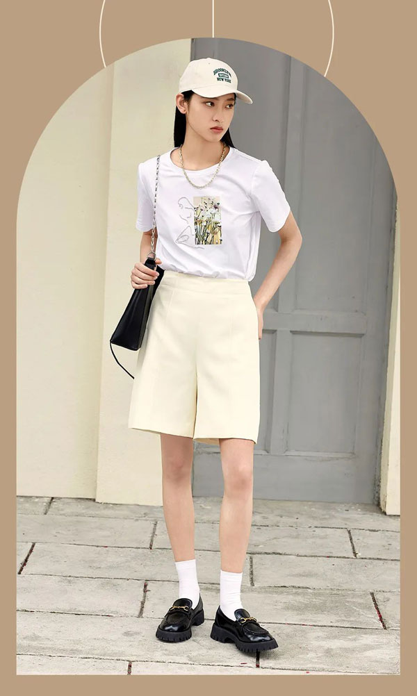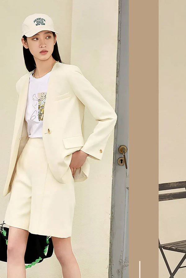 在秋天,我們的心境似乎也邁向理性,同色系便西套裝成為提升職場軟實力的抓手,簡約白色短袖,附加錯落有致的秋日花卉圖案,成為搭配便西的加分項。