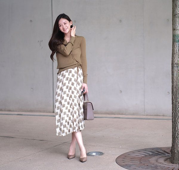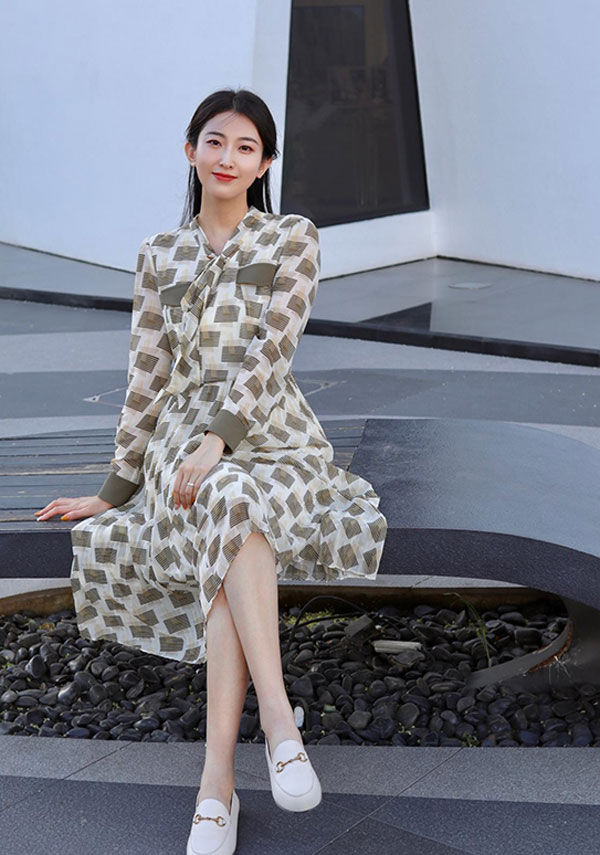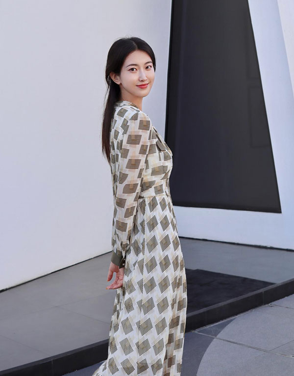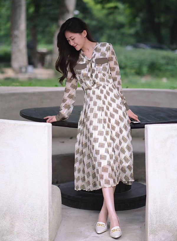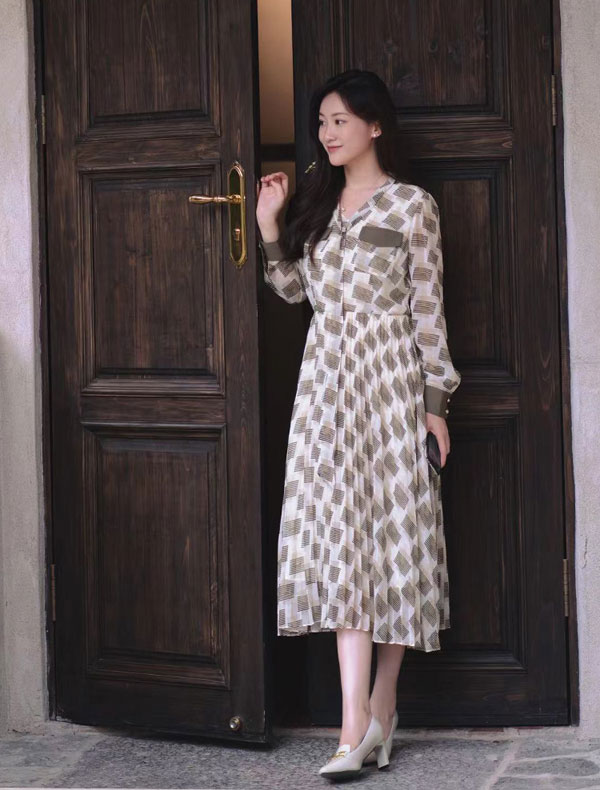 JZ玖姿經典的連衣裙修身廓形,為優雅女性姿態增添幾分柔和、靈動、自然。融合綠色基底色調與立體壓褶,于裙擺搖曳間,世間恬淡溫柔,歲月一片靜好。