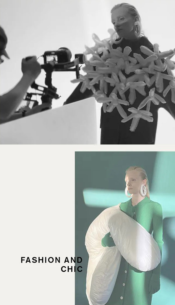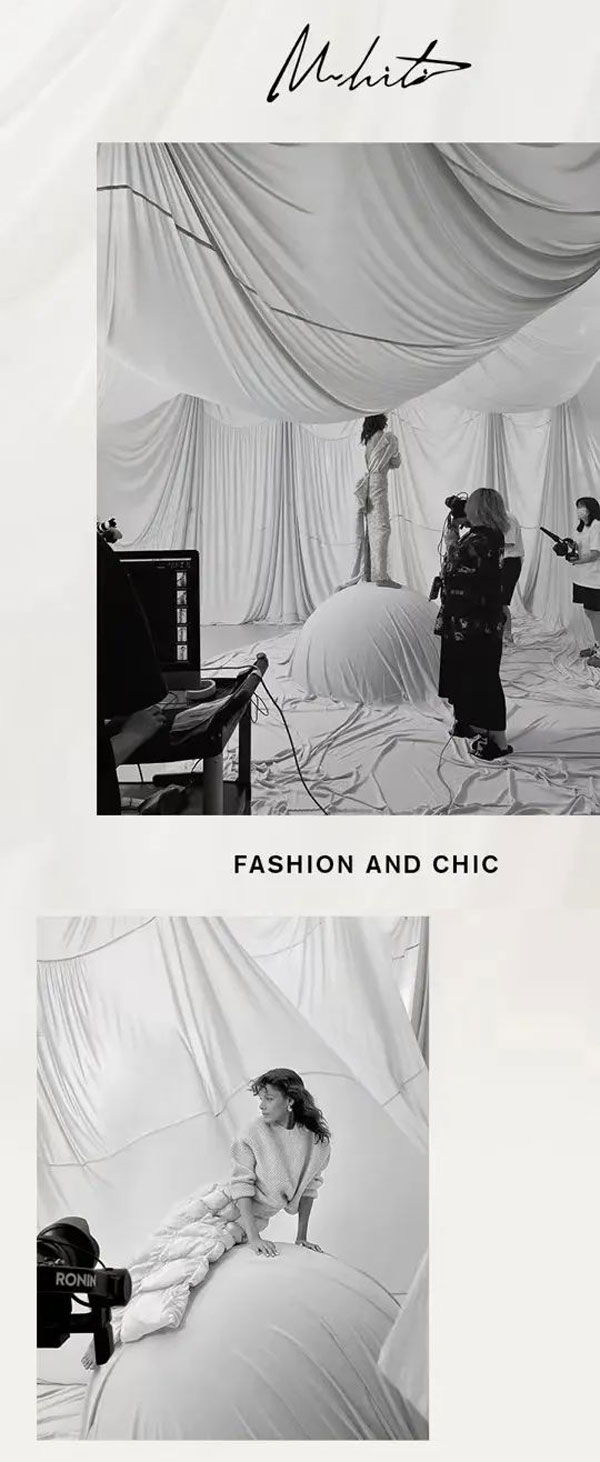 畫面由黑白轉入彩色,飄蕩的暖杏色布幔似海浪涌動,令人沉浸在溫柔的空氣中。簡約而富有張力的廓形,運用環保材料和特殊工藝結合,兼具實用主義與服飾美學。優雅長尾裙擺、藝術感印花,在光影中定格時裝影像,演繹秋冬沉靜之美。