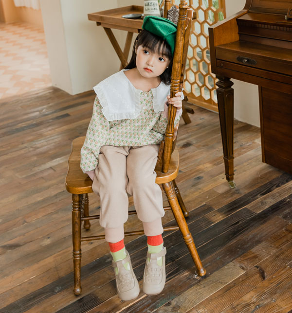 如果想要顯得臉蛋小巧精致,穿這款碎花襯衣就對了!小碎花給人無比清新的感覺,大翻領則獨具域外風情。不僅如此,還可以讓寶寶的臉蛋修飾地更加精致。下身配一條淺色系休閑束腿褲超級好看。如果覺得顏色太過淺淡,可以嘗試這款空姐帽,另外,柿子紅色的襪子也能為寶寶添姿添彩。