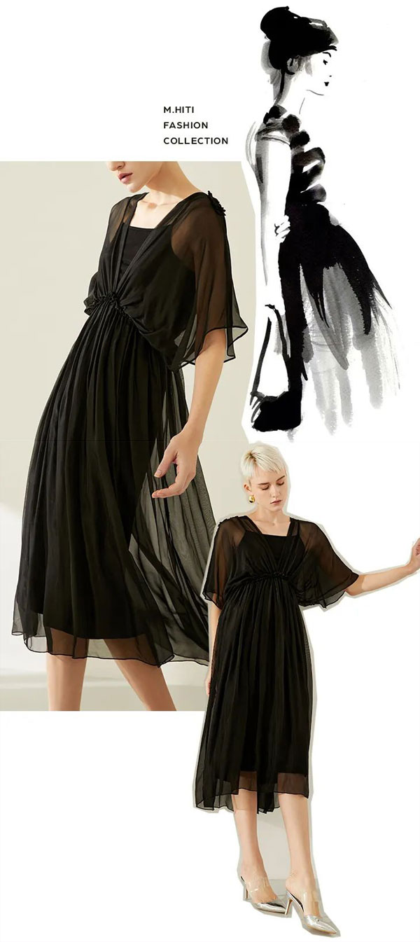 不必擔心All Black略顯沉悶,輕盈透氣的真絲薄紗,讓你在夏日感受微風輕拂的溫柔。面料親膚柔軟且飄逸,似有似無的存在感如煙一般輕柔。針織里托底勾勒出層疊、清透靈動的層次感,V領(lǐng)蝙蝠袖結(jié)合