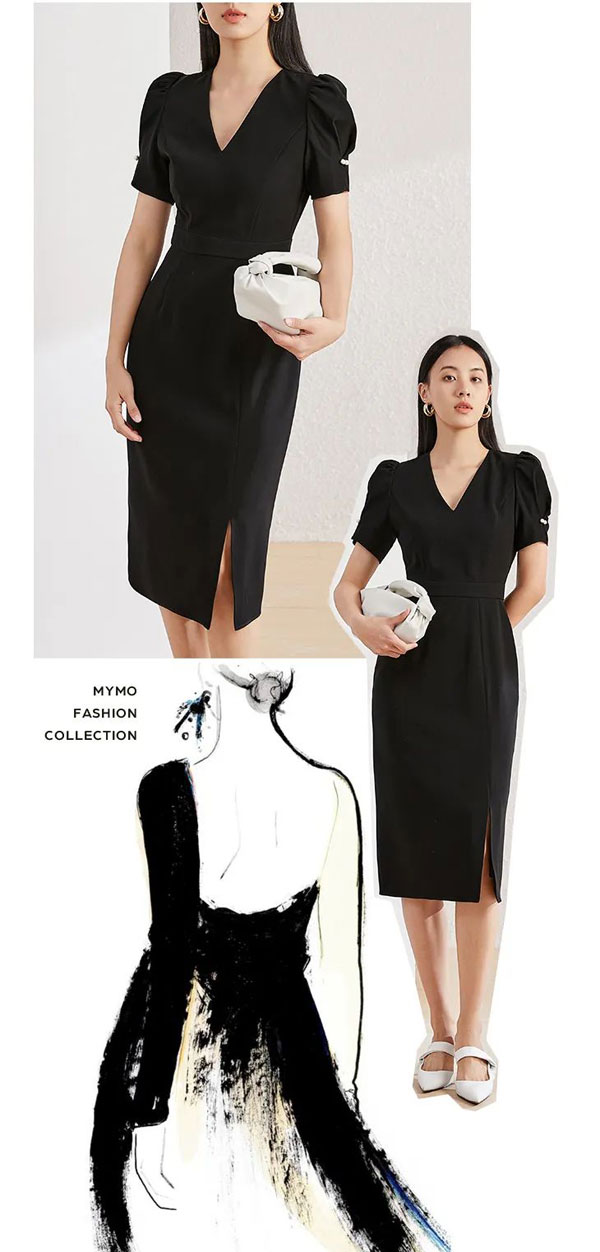 小黑裙,是衣櫥里利用率極高的單品,經(jīng)典百搭又簡約大方,于上班通勤和約會休閑之間達成完美平衡。修身版型包裹身形更顯凹凸有致,韻味十足。羊腿袖設(shè)計,寬肩效果立顯,華麗優(yōu)雅又不失利落簡約。V領(lǐng)與前下擺處開叉相呼應,追求小面積不經(jīng)意的露膚方式,聰明地玩性感。