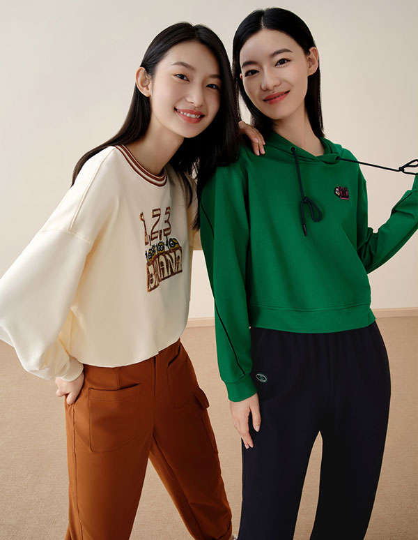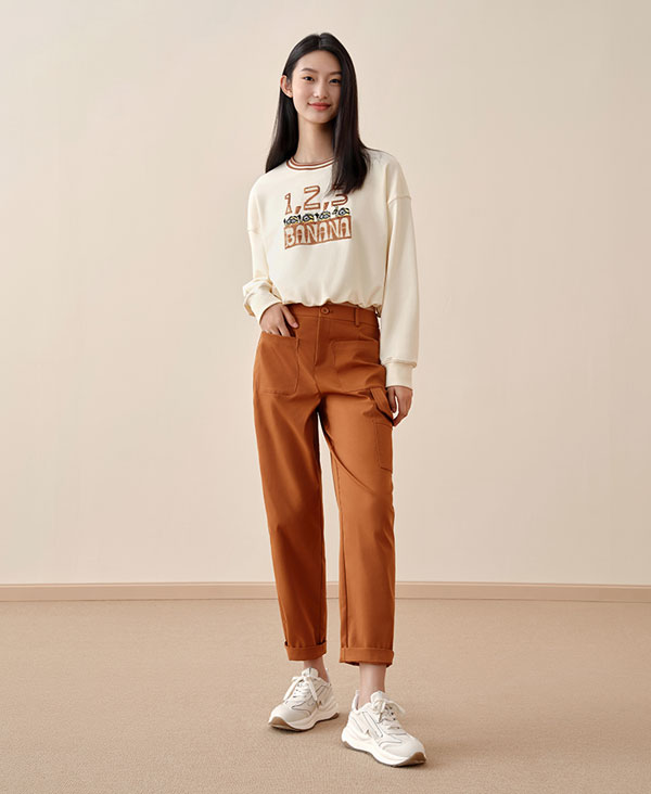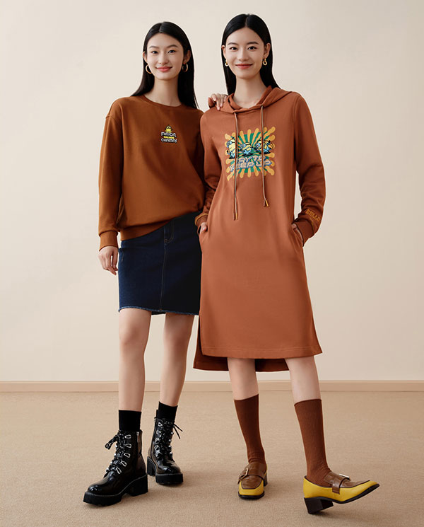南瓜色圓領(lǐng)刺繡衛(wèi)衣,活力滿滿。略寬松廓形剪裁,上身輕盈自如。精細(xì)工藝描繪生動(dòng)小黃人圖案,歡樂(lè)氛圍無(wú)限延伸。