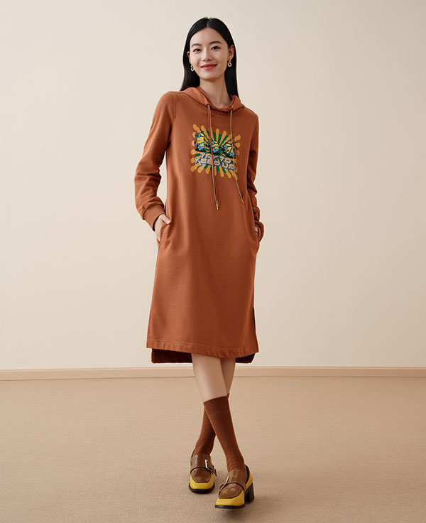 南瓜色刺繡衛(wèi)衣裙,輕松隨性。胸口復(fù)合工藝小黃人圖案,更顯精致。雙色抽繩點(diǎn)綴,增添運(yùn)動(dòng)休閑感。