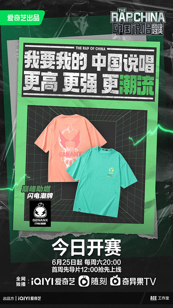 愛奇藝經典IP重磅回歸!《中國說唱巔峰對決》集結說唱界OG和當紅廠牌Rapper 等一眾哈圈RapStar打破說唱格局,強強對決和聯盟,巔峰爭霸。GENANX閃電潮牌獲得節目官方正版授權,推出“巔峰助燃,閃電制燥”聯名系列。攜手推動說唱文化傳遞正能量,向世界展示中國的說唱力量。
