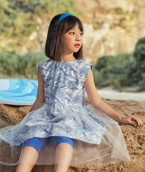 無袖海豚印花連衣裙,大膽地將大海和活潑可愛的小海豚海洋元素躍然衣上,讓人不禁會想起陽光、沙灘和海浪,輔以夢幻而又迷離的網紗,搭配同色系七分褲,涼爽無懼炎熱,輕松玩轉夏日度假風穿搭魔法。