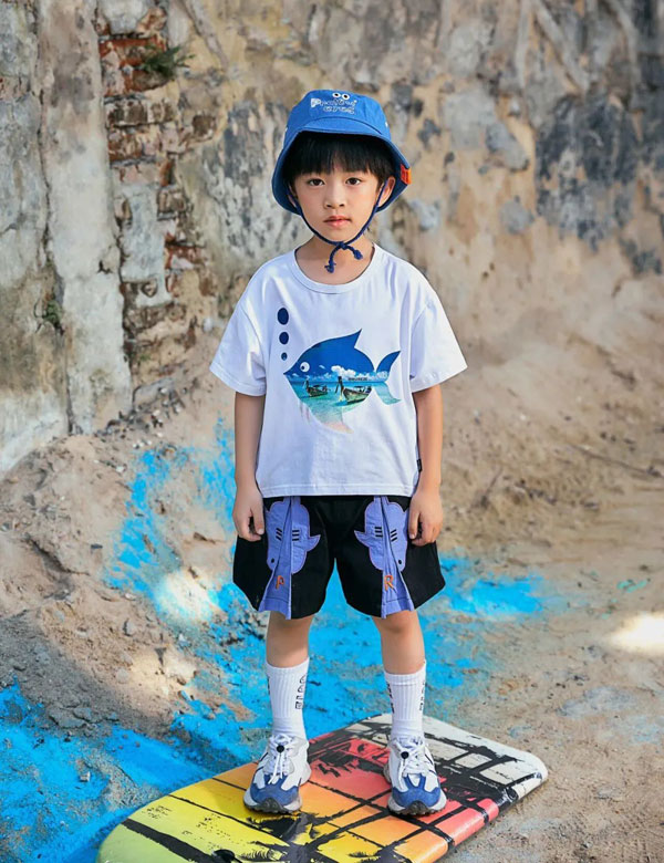 海藍色卡通印花小魚白T,搭配藍色可愛瑞仔IP刺繡工藝黑色短褲,款式簡單休閑,方便穿脫。黑與白的色彩撞擊,同時點綴舒適的藍色,營造出吸睛的視覺效果。