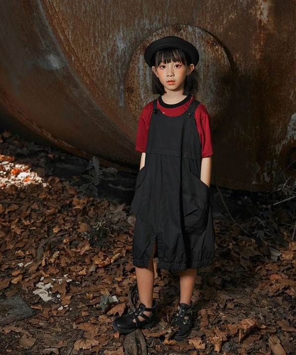 棗紅色圓領T恤,色彩柔和,款式簡單;黑色背帶裙兩側對稱的超大口袋,實用而又不乏時尚。棗紅色T恤搭配黑色背帶裙簡約而不簡單,上身簡直秒變高街小美女。