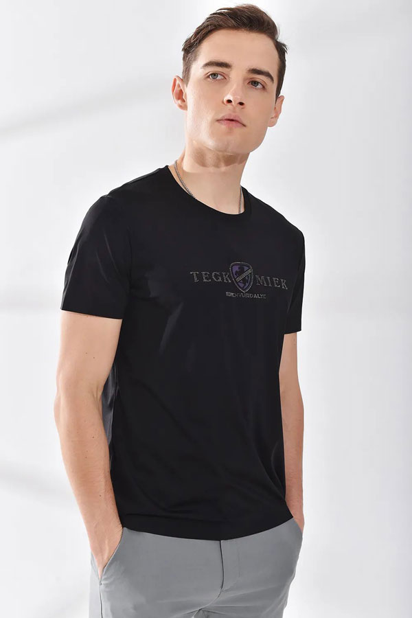 時尚休閑系列,常規圓領短袖版型,100支親膚錦綸面料,微速干材質,不易發臭,3D凹凸天地模圖案,歐鉆字母點綴,通勤多種場合,舒適典雅,“爸”氣十足!