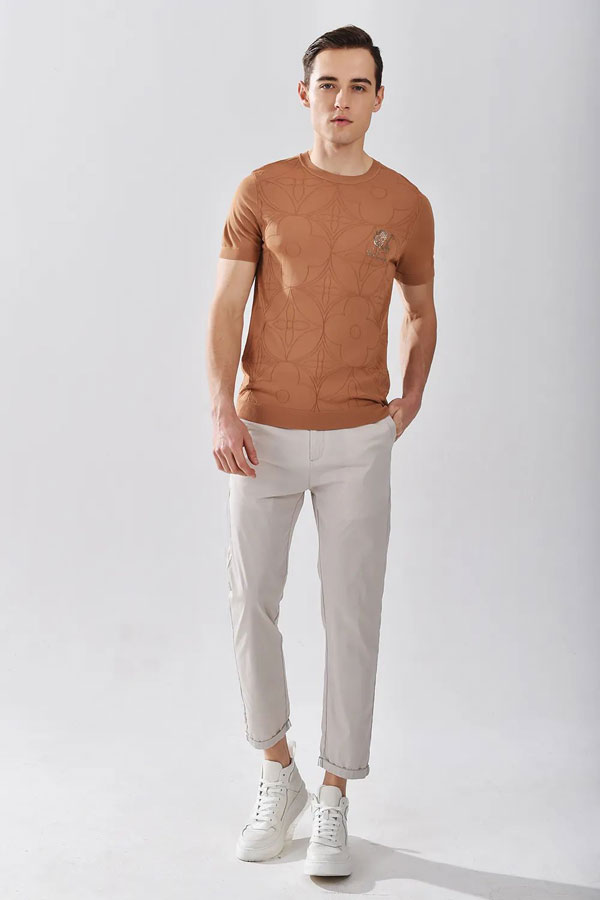 都市時尚系列,經典圓領短袖版型,面料選用伊力特定位提花紗材質,歐式定位前衫身提花,奧鉆胸花點綴,清爽精致有工藝感,讓父親把品質穿身上。