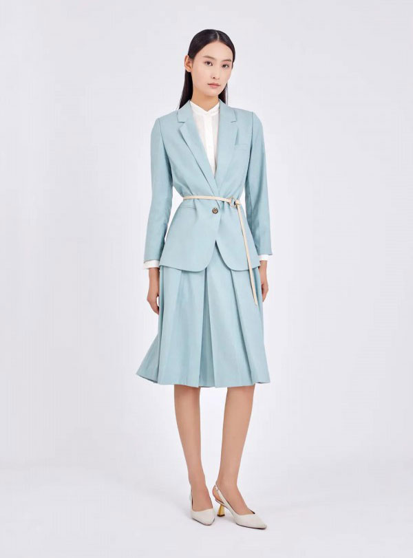 淡雅的藍色套裝,硬朗與柔和完美結合,有現代女性的“心有猛虎,細嗅薔薇”的品質,從容有度,風格立現。