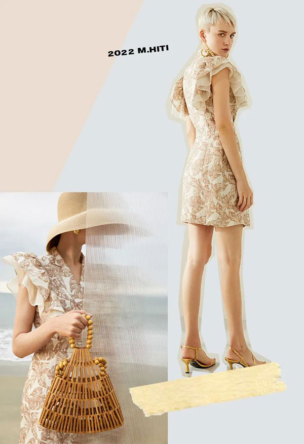 向往度假的心蠢蠢欲動,換上輕盈裙裝,開啟愉悅假期。海貝色絲麻樹皮縐葉子印花裙,肩部雙層荷葉邊柯根紗拼接,如浪花堆砌爛漫幻想。