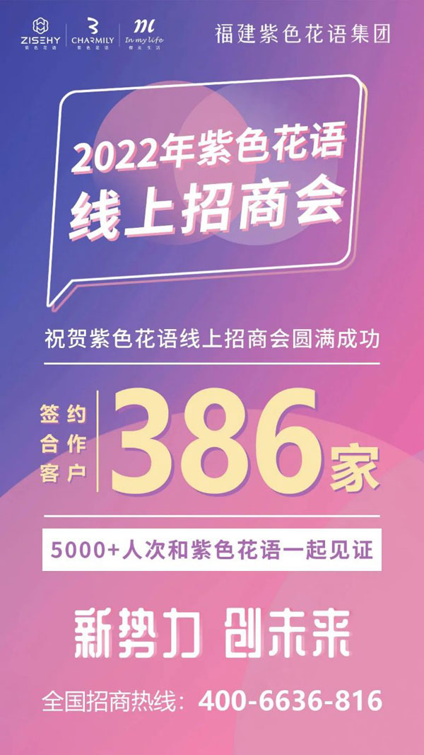 2022年3月26日,紫色花語開拓創新思維,打破線下地域的局限,將2022品牌招商會搬到線上直播間,讓全國各地的意向客戶,都能足不出戶把握財富商機,贏戰2022!成功簽約386家!為紫色花語增添了新的力量,與更多志同道合者攜手創富!