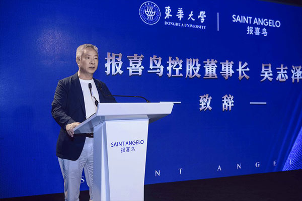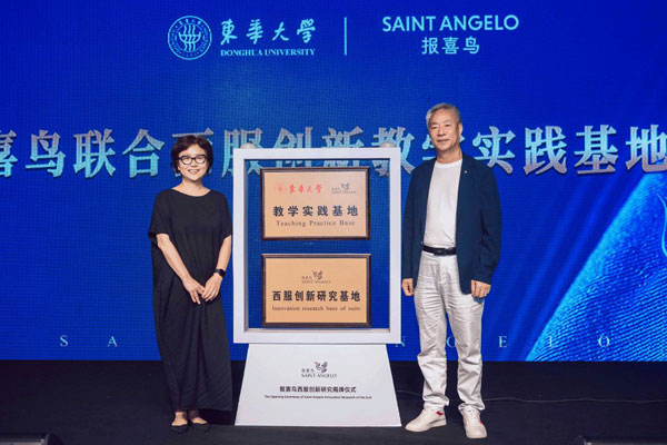 在簽約儀式上,報喜鳥控股董事長吳志澤先生與東華大學服裝與藝術設計學院副院長王朝暉女士就此次合作都充滿信心和期待,同時雙方代表也為共同建立的西服創新研究教學實踐基地進行正式揭牌。吳董在發言中也希望通過今后的持續合作,將自身在西服研發制造領域的專業優勢做實做強。