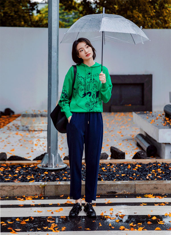 天氣變幻,秋雨微涼,柔軟溫暖的綠色連帽毛衫搭配休閑褲,行走在街頭,恰到好處的色彩、涂鴉、線條,覆滿慵懶、自由的氣息,升騰著不嚴自明的默契,抵達內心的溫暖舒適。