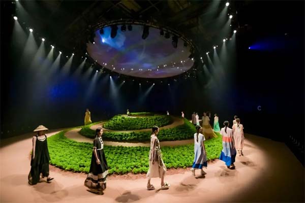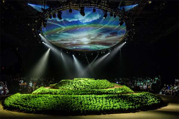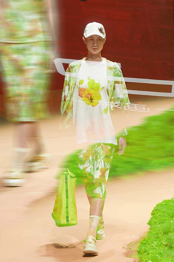 不同以往,2023春夏大秀另辟蹊徑,將生機勃勃的大自然搬運到秀場,一座綠植覆蓋的山野佇立于秀場中央,以獨特的圓弧形向四周輻射,當光影交錯人聲匯聚,生命的盎然由此蔓延。