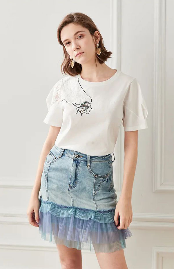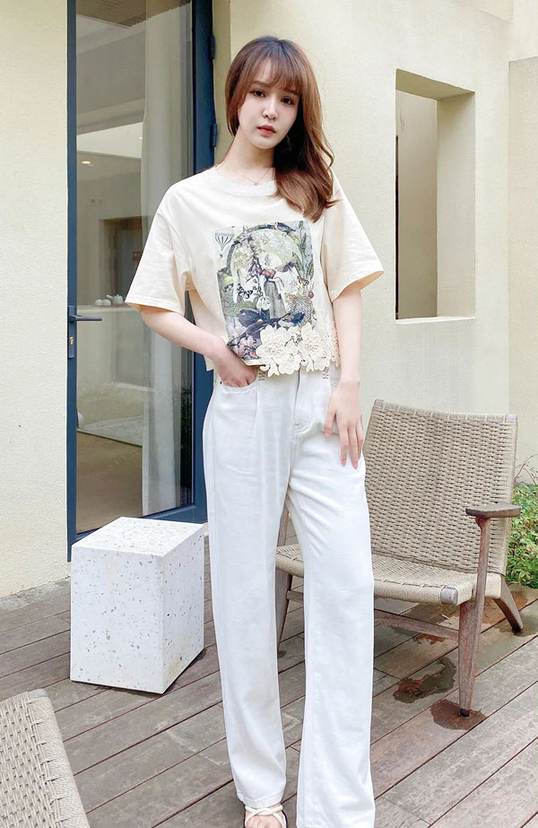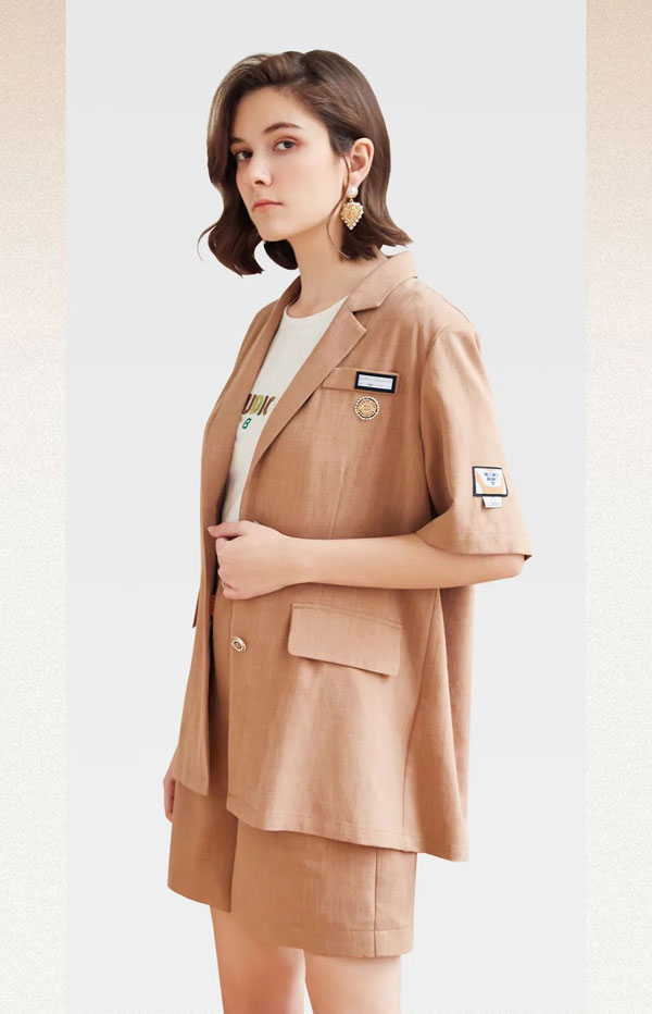 仕女圖T恤,圖案運用了貼布繡\膠印\手工感繡線等多種工藝,在夏季穿著舒服透氣,簡約的輪廓打造日常的出勤裝束,營造出全新的山河湖海的自然風景,閃蔥交織西裝短褲,腰部撞色定制松緊,低飽和度、夏季輕盈的代表。