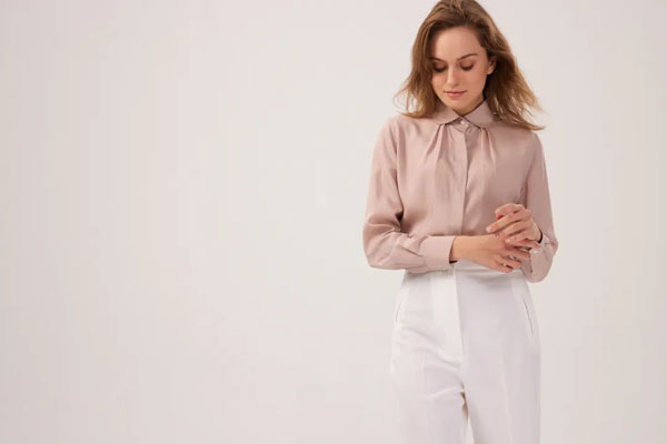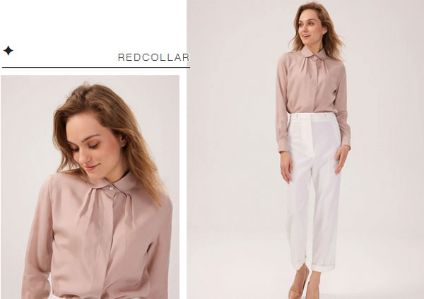 2022紅領(lǐng)女裝定制獨(dú)特研發(fā)了這款銅氨纖維襯衫,伊頓圓領(lǐng)設(shè)計(jì)與粉色的調(diào)性相呼應(yīng),還原女性可愛、溫婉的一面,削弱正式服裝帶來的刻板。同時(shí),這種面料清爽柔軟,懸垂性極佳,屬于綠色環(huán)保面料,更加便于打理。