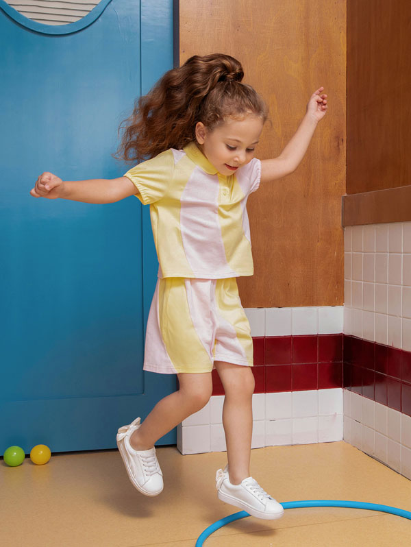 圓弧形色塊拼接,像一塊彩色泡泡軟糖。采用新疆長絨棉而制,針織的魔法是鎖住柔軟清涼,甜美色彩。
