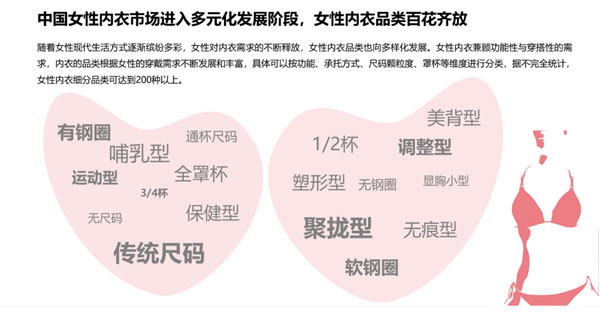 隨著女性現(xiàn)代生活方式逐漸慎紛多彩。女性對(duì)內(nèi)衣需求的不斷釋放。女性內(nèi)衣品類也向多樣化發(fā)展。女性內(nèi)衣兼顧功能性與穿搭性的需求。內(nèi)衣的品類根據(jù)女性的穿戴需求不斷發(fā)展和豐富,具體可以技功能,承托方。尺瑪順粒度。罩杯等堆度進(jìn)行分類。據(jù)不完全統(tǒng)計(jì)。女性內(nèi)衣細(xì)分品類可達(dá)到200種以上。