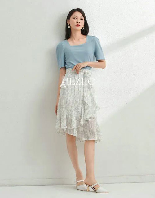 雪紡材料在夏季是公認的、非常透氣的、輕薄面料,高級的垂感顯瘦又優雅,方領的款式能夠很好的修飾頸部線條,法式復古風拿捏的死死的!不規則的裙擺中長款的設計對小個子女生也非常友好哦!