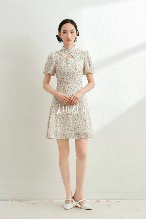 旗袍裙向來能很好地體現出中國女人的莊重氣質,復古意味滿滿,而領口鏤空的設計又保留了現代審美的性感,泡泡袖的設計更加浪漫精致,A字裙擺對于身材的包容性會更加高哦!
