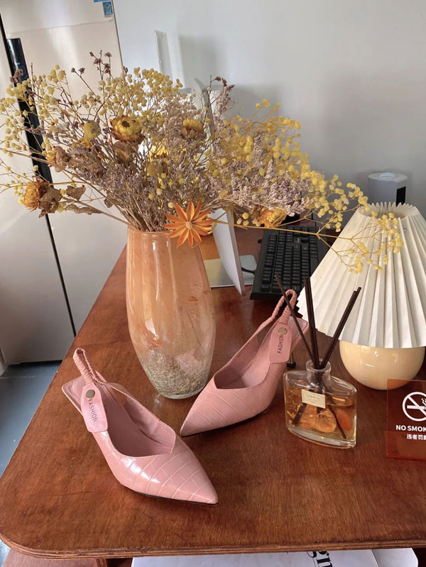尖頭鞋在夏季搭配很出彩,它比圓頭鞋看上去更精致,搭配V型鞋口設計,在視覺上拉伸比例顯腿長。而貓跟鞋型較低矮小巧,就算是少女感滿滿的粉色,也不會太過惹眼,反而自帶溫文爾雅的氣質。