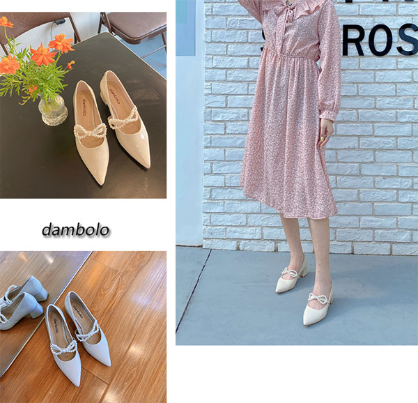 這款鞋子最大的亮點,就是鞋身中間用珍珠蝴蝶結飾花來點綴,自然而然的甜美氣息襲面而來。不僅巧妙豐富了鞋身,還襯托出可愛溫柔的氣質。而尖頭的設計,也彰顯出利落率性的一面。
