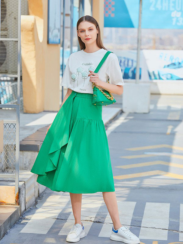 今年非常流行綠色,一款明亮的綠色半身裙,采用舒適的棉質面料設計,剪裁精致,荷葉邊的裙擺增加亮點,獨具設計感。搭配一件白色T恤,簡約時尚,清新又自然。