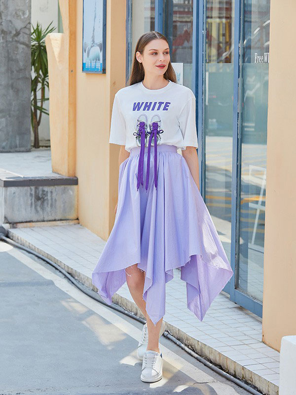 要說今年春夏季最最最流行的顏色,我想香芋紫色一定是首當其沖,溫柔又高級的淡紫色給人很舒服的感覺。一條不規則裙擺的淡紫色半身裙,有著不一樣的俏皮活潑感。搭配白色T恤,好看到不行。T恤上的紫色印花更是與半裙相呼應,很相配!