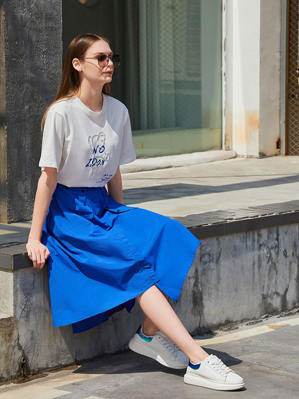 簡約清新的藍色T恤,顏色上很顯膚白,很適合天氣炎熱的春夏季穿著。搭配一條黑色高腰半身裙,輕盈飄逸,簡單實穿,春夏季這樣的搭配絕對是最實穿的造型。