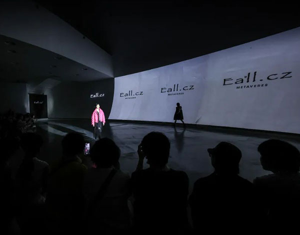 大秀現(xiàn)場,獨具一格的建筑造型,從內(nèi)核迸發(fā)的靈感纏繞流動。一如時裝的千變?nèi)f化,于銀河中流動。燈光驟暗,屏幕亮起,主題視頻配合明快旋律,拉開EALL.C乙新一季大秀帷幕。
