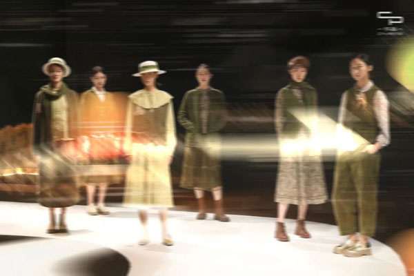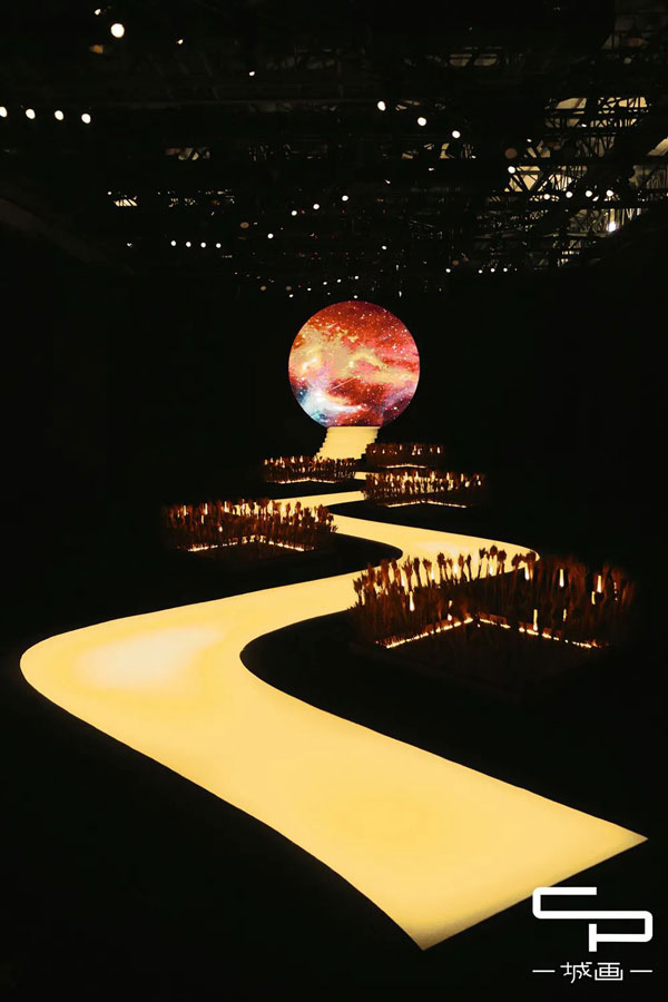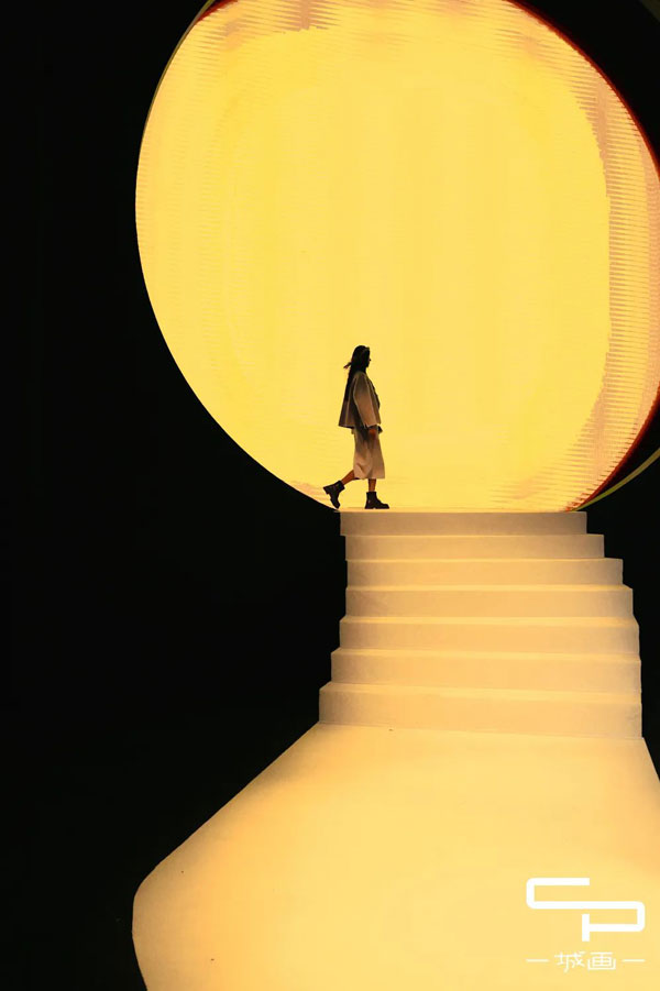 月往日來,旭日緩緩東升,一縷溫暖和煦的光線染紅秀道。燈光隨節奏漸亮,暖光充盈整個空間,模特們披光而來。