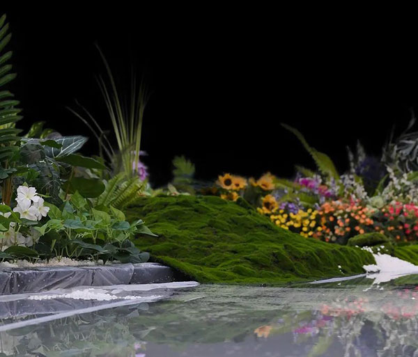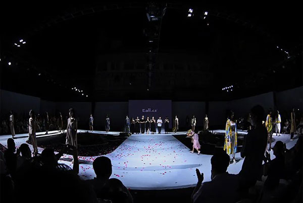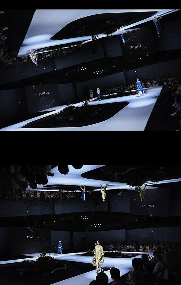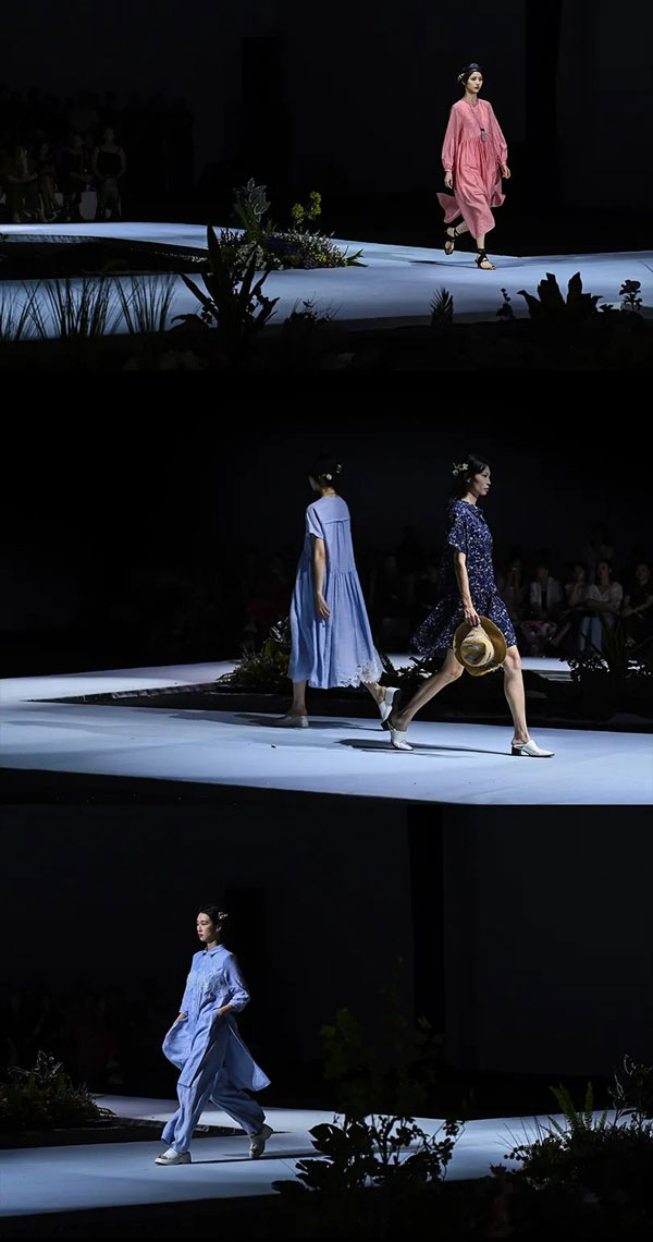 斑斕無彩的花園和純凈的夜空交織融合,黑白主色調構筑起簡潔的秀場空間。置身其中感受到徐徐微風,平靜而悠遠,自然而又舒適。