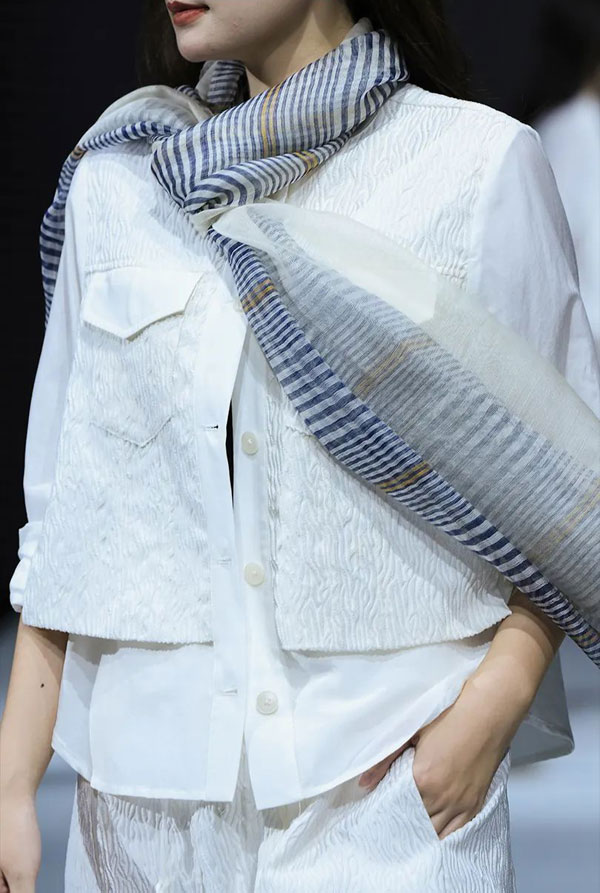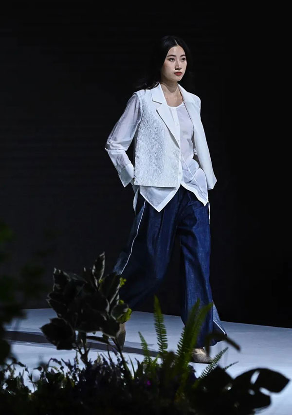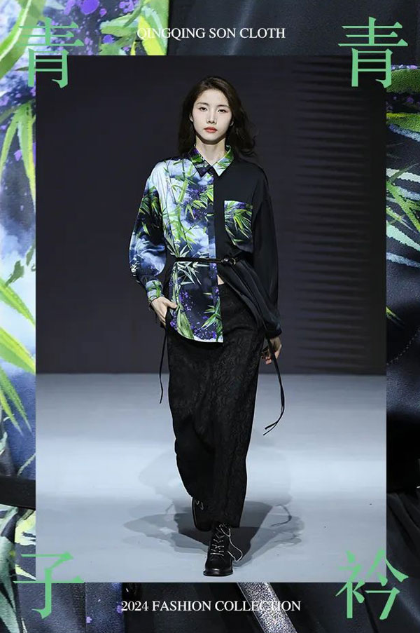 從上古先民低吟淺唱的“青青子衿”到白居易感概的“江州司馬青衫濕”,青色帶給我們的感受是多變的。運用拼接面料攜以刺繡提花等工藝,褶皺的流動循著青色的脈絡,從另一角度感受時尚的輪回,探索色彩藝術帶來的視覺潛力。