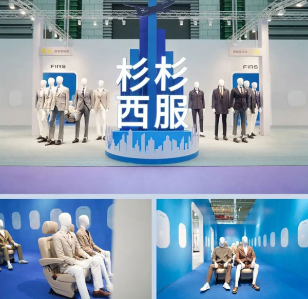 杉杉品牌以“型動商旅”為主題亮相展廳,展館空間設計以簡潔、現代的航空商旅場景為基礎,矩陣式的模特兒組合以及沉浸式場景展示,讓科技感和時尚感更有沖擊力、時代特征,不僅彰顯商旅人士沉穩、干練的內在品質,更是杉杉西服新風格瀟灑的一面。