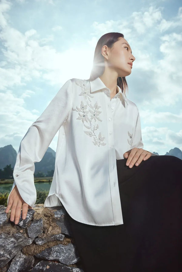 指尖的技藝、無字的史書國家級非遺·貴州苗族刺繡,卡蔓二〇二三苗非遺系列以現代設計語言構建起情感的紐帶,將源生于東方源遠文明與民族工藝的魅力以當代時裝的手法呈現。重塑傳統文化中值得珍視的時裝價值一一苗繡鴿子花。在文化自信的推動下,提煉貴州梵凈山特有鴿子花為元素,描繪極簡東方的美學新維度。