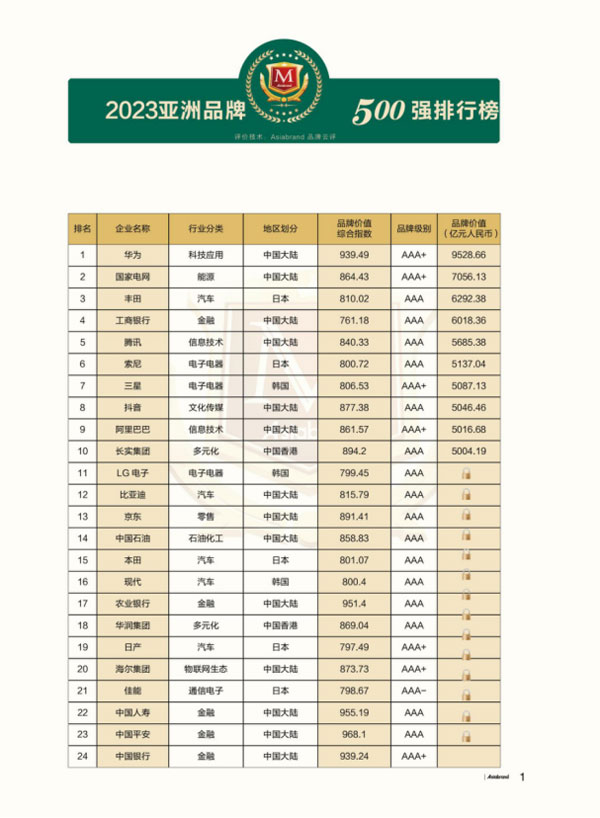 亞洲品牌研究院創始院長周君發布“2023亞洲品牌500強”榜單并進行了分析解讀。華為、國家電網、豐田、工商銀行、騰訊科技、索尼、三星、抖音、阿里巴巴、長實集團榮登榜單Top10。華為成為2023亞洲最具價值品牌,品牌價值達到9528.66億元人民幣。比亞迪、京東、泰康保險、華帝、美的、洽洽等一批民營企業也榜上有名。
