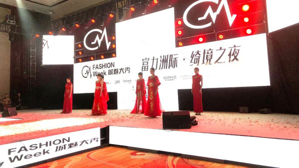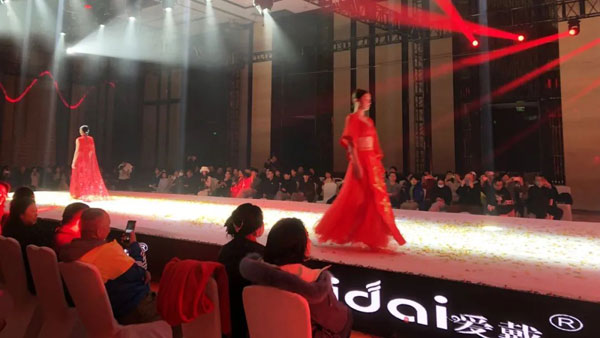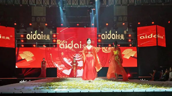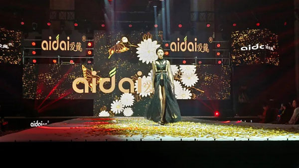 燈光聚焦,音樂漸起,但見倩影,氣韻靈動。身穿愛戴新品的模特盛裝亮相,身披紗袍長裙,一步一搖彰顯國風優雅,舉手投足詮釋品牌魅力。