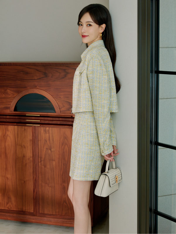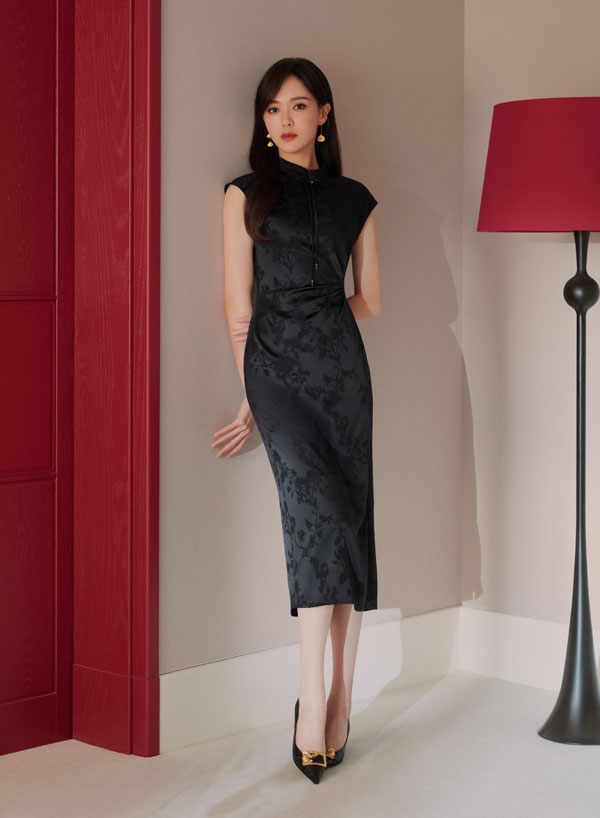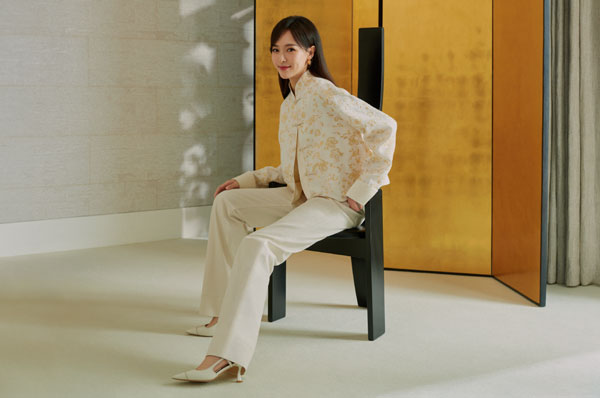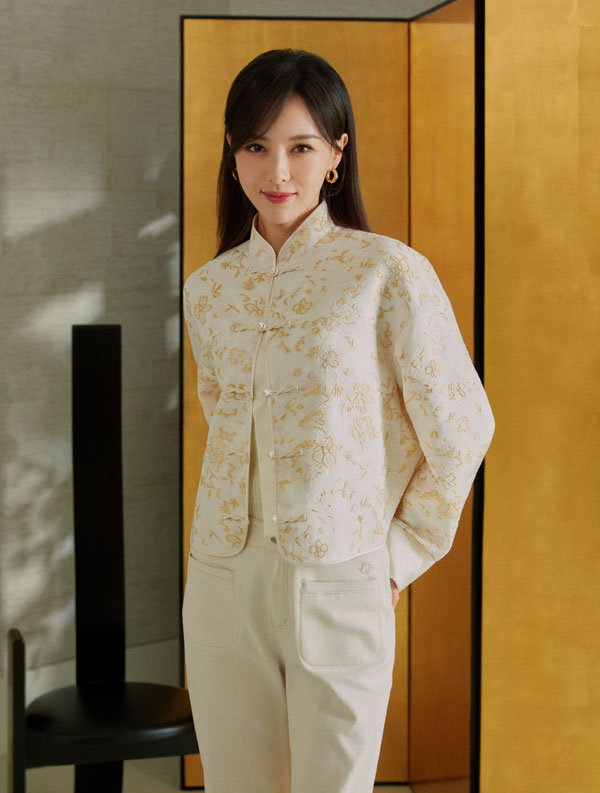 真絲國(guó)風(fēng)提花連衣裙對(duì)古典旗袍制式加以改良,牡丹纏枝紋提花緞與中式立領(lǐng)設(shè)計(jì)存續(xù)古韻,符合人體曲線的開衩剪裁和飛袖設(shè)計(jì)保證舒適的穿著體驗(yàn),腰間褶皺烘云托月,勾勒曼妙輪廓。米金配色花鳥金絲提花箱型夾克優(yōu)雅清貴,緞面盤扣與醋酸材質(zhì)袖口折邊,在細(xì)節(jié)幽微處展現(xiàn)東方魅力。